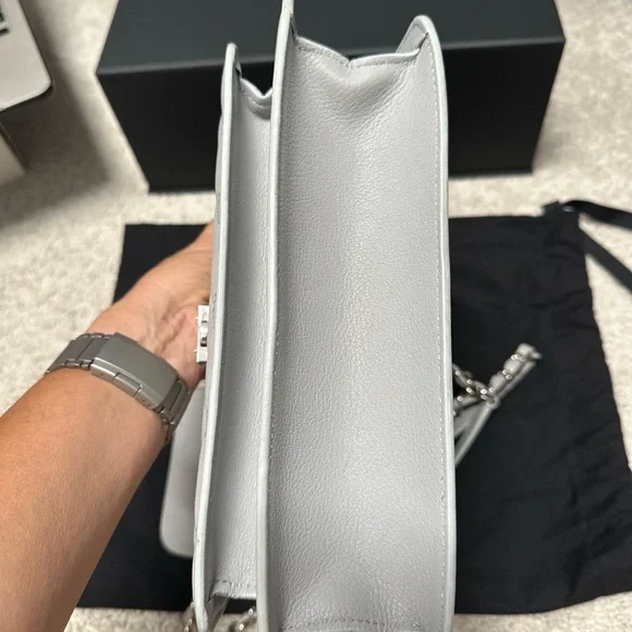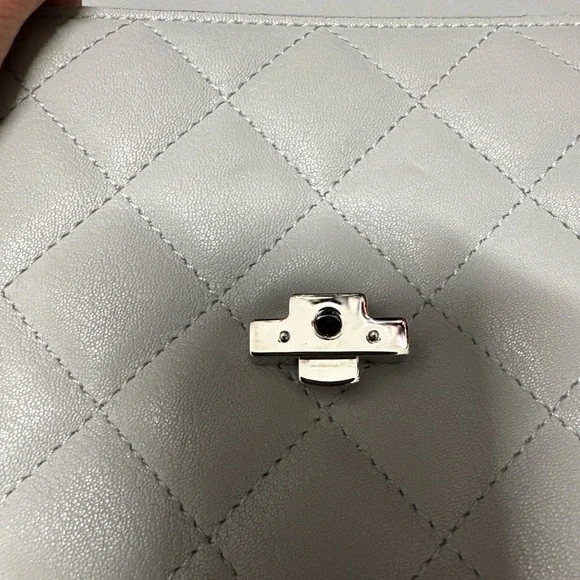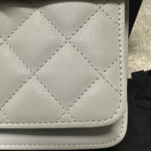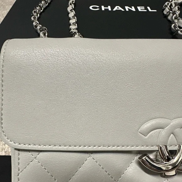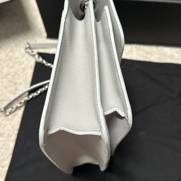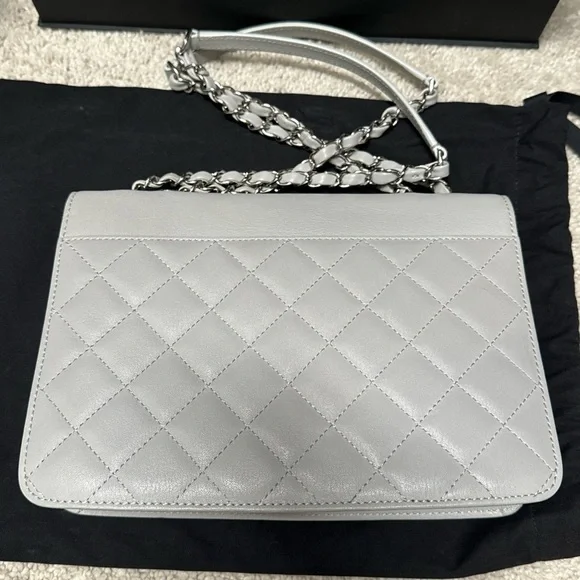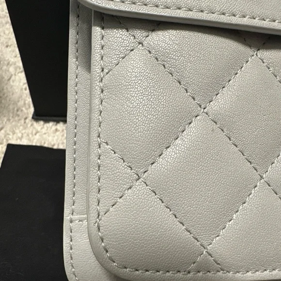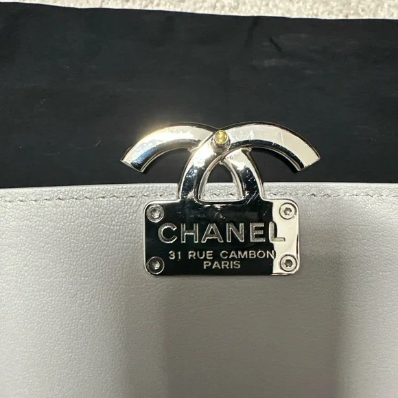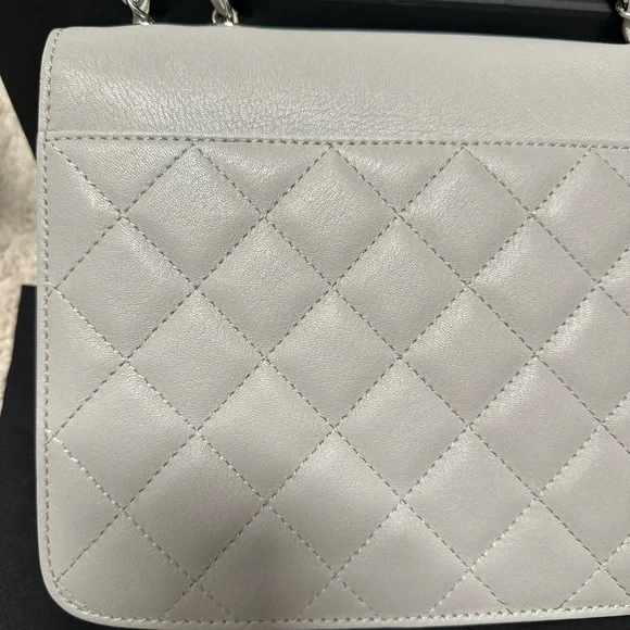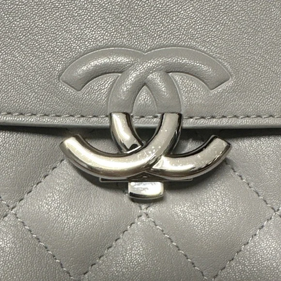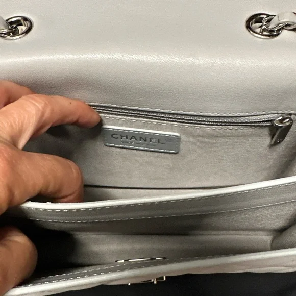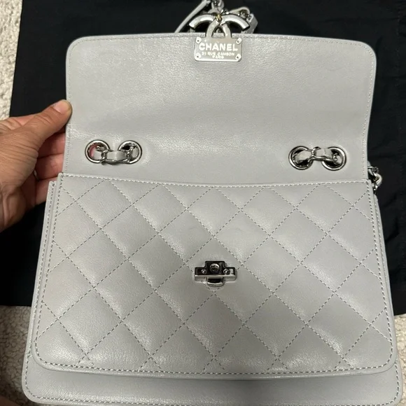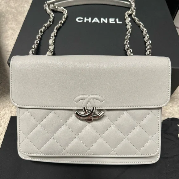 CHANELCC Box Flap Bag in light grey.Comes with Box, Dust Bag, Sales Receipt, Authenticity Card, Product Tag.The Bag has NEVER been used but does has a few light scratches on the CC clasp from handling the first few days after purchase.You have to look for them as they are tiny.See pics. No odor, has been kept in bag and box since purchase.From a non smoking home. Strap can be used as a crossbody, shoulder or smaller for under arm on shoulder.Very versatile Accessories: Chanel box, dust bag, sales tag, receipt, authenticity card Measurements: Handle Drop 10.5", Height 7", Width 9.5", Depth 3", Strap Drop 18"Designer: ChanelModel: CC Box Flap Bag Quilted Calfskin SmallExterior Material: Leather Exterior Color: Gray Interior Material: Fabric Interior Color: Gray Hardware Color: Silver Brand Code: 25438300
